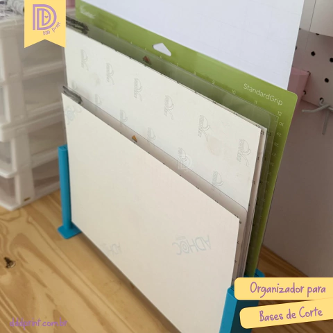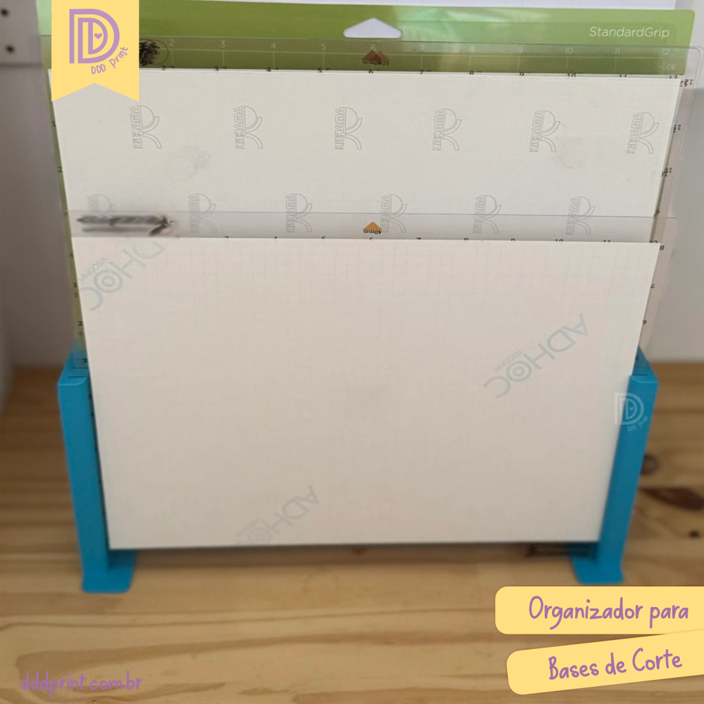 Estante utilizada para armazenar as bases de corte de forma reta e individual, impedindo que elas fiquem tortas ou coladas umas nas outras. Suporta o armazenamento de até 5 bases, compatível com bases de tamanho A4 e 30x30.